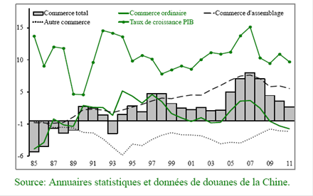 « Le gonflement de l’excédent était aux deux-tiers attribuable aux activités d’assemblage. Attirés par les faibles coûts d'entrée dans ces activités, les investisseurs étrangers ont développé en Chine des sites de production globalisés étroitement liés à une demande extérieure en forte expansion, notamment dans les biens électroniques. Mais le « commerce ordinaire » a contribué aussi à la montée de l’excédent global en passant d’un léger déficit à un excédent massif. Ce retournement de position était principalement dû aux investissements des entreprises chinoises dans deux secteurs de l’industrie lourde : «Machines » et « Métaux de base ». La demande internationale et les politiques nationales de substitution aux importations a alimenté ainsi l’explosion de l'excédent commercial. » « Le rééquilibrage de l’économie chinoise : Etat des lieux. », Françoise Lemoine et Denis ünal